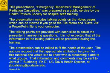 Title: This presentation, "Emergency Department Management of Radiation Casualties,