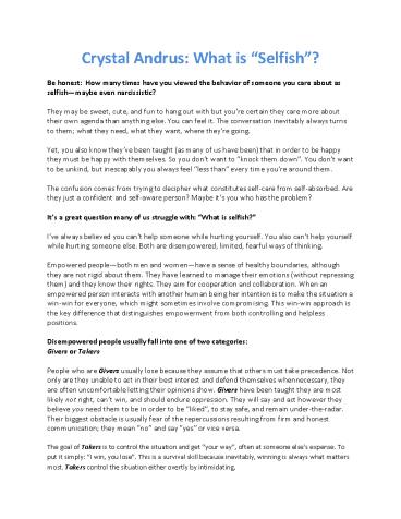 Crystal Andrus: What is “Selfish”? PowerPoint PPT Presentation