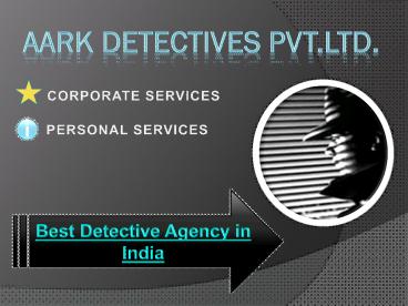 Aark Detective is leading Detective Agency work more then 30 years in the Investigation field. Solve all types of Personal/ Professional/ Crimanal/ Cyber Crime Cases also do background verification. Best Private Investigators in india. – PowerPoint PPT presentation