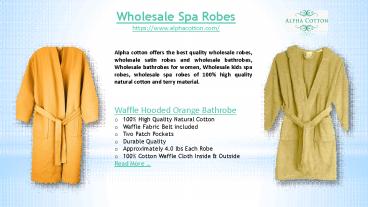 If you are searching for the wholesale spa robes than please have a look at alphacotton.com. We have wide range of products related silk robes, waffle robes etc. – PowerPoint PPT presentation