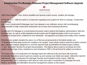Title: Construction Pro Manager Releases Project Management Software Upgrade