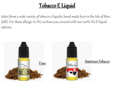 Select from a wide variety of tobacco e liquids, hand made here in the Isle of Man (UK). For those allergic to PG, we have you covered with our 100% VG E liquid options. – PowerPoint PPT presentation