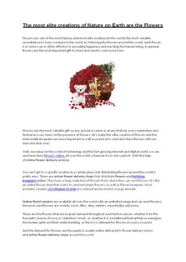 Online florist services are available all over the world with an unlimited range and can send flowers; the most used flowers are orchids, roses, lilies, daisy deletes, mixed tulips and more. – PowerPoint PPT presentation