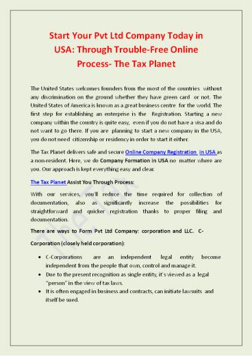 Start Your Pvt Ltd Company Today in USA: Through Trouble-Free Online Process- The Tax Planet PowerPoint PPT Presentation