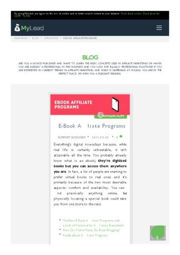 ebook A?liate Programs that the internet has in store. First up, lets talk about Kindle the primary reading app for all your devices. Under the Amazon Kindle E-Book A?liate Program, a?liates can earn 3 for every person who signs up for the Kindle Unlimited Free Trial or purchases the 6- month membership. The 12 and 24-month memberships earn you 5 and 10 on each purchase, respectively. Another popular program is the E-Books.com A?liate Program where you can earn a generous 8-15 commission on every sale based on your monthly performance! Best of all, the cookie period is 45 days, so its a viable option for beginners. The highest-paying program on our list is the E- Book Maestro A?liate Program. It pays a huge commission of 40 on every single e-book you sell. Their website claims that if you play your cards right, you could be looking at an easy 10,000 annually. Sounds tempting, doesnt it? But dont make any hasty decisions, its best to take your time and read up on what more is out there. There are so many A?liate Programs for Selling Ebooks, and this niche is only growing bigger. You could be at the forefront of it all, making steady money. Ebooks and ebooks readers have been killing it for the past couple of years, we all know that. So why shouldn't you take advantage of that and start promoting the best Ebook A?liate Programs? If your audience is interested in books in general, that's your time to step in! Ebook A?liate Programs should be easy to promote and it will bing you a very satisfactory results for sure. Especially for you, we're presenting a list of the most recommended Ebook A?liate Programs from MyLead so you don't have to worry about ?nding it yourself. Go and