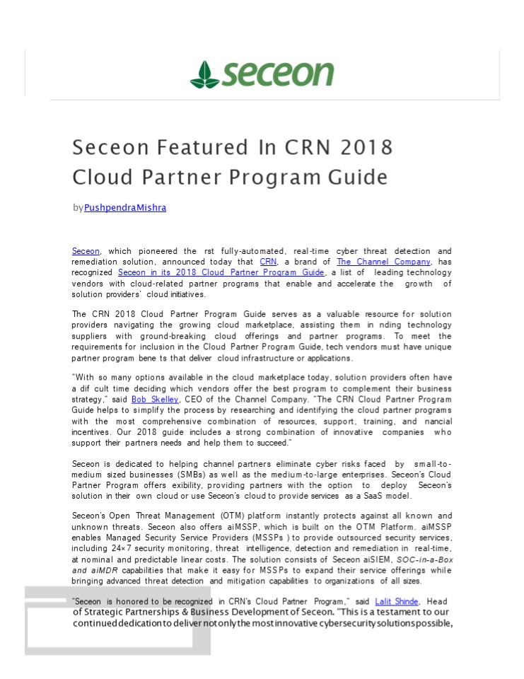Title: Seceon Featured In CRN 2018 Cloud Partner Program Guide