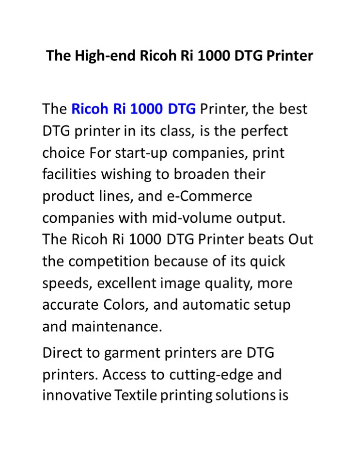 6functionality. The Ricoh Ri 1000 DTG printer is a