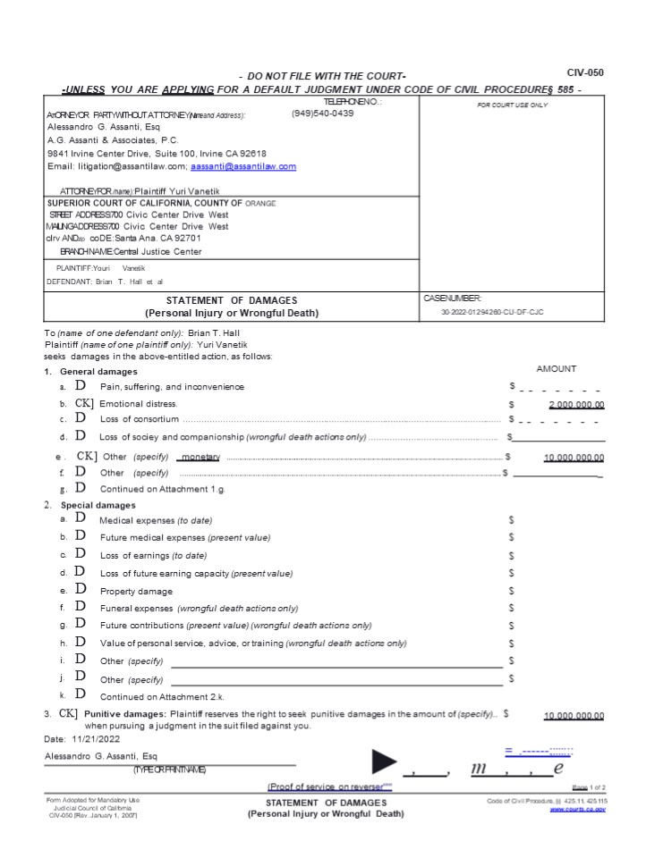 TELEPHONE NO. ATTORNEYOR PARTYWITHOUT ATTORNEY(Name and Address) (949)540-0439 Alessandro G. Assanti, Esq A.G. Assanti Associates, P.C. 9841 Irvine Center Drive, Suite 100, Irvine CA 92618 Email litigation_at_assantilaw.com aassanti_at_assantilaw.com ATTORNEYFOR /name)Plaintiff Yuri Vanetik FOR COURT USE ONLY