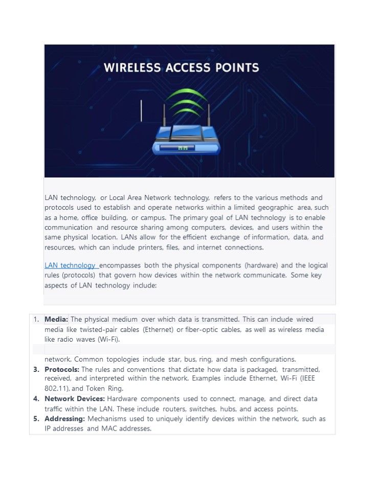 media like twisted-pair cables (Ethernet) or fiber-optic cables, as well as wireless media like radio waves (Wi-Fi). Topology The arrangement of devices and how they are interconnected within the network. Common topologies include star, bus, ring, and mesh configurations. Protocols The rules and conventions that dictate how data is packaged, transmitted, received, and interpreted within the network. Examples include Ethernet, Wi-Fi (IEEE 802.11), and Token Ring. Network Devices Hardware components used to connect, manage, and direct data traffic within the LAN. These include routers, switches, hubs, and access points. Addressing Mechanisms used to uniquely identify devices within the network, such as IP addresses and MAC addresses. media like twisted-pair cables (Ethernet) or fiber-optic cables, as well as wireless media like radio waves (Wi-Fi). Topology The arrangement of devices and how they are interconnected within the network. Common topologies include star, bus, ring, and mesh configurations. Protocols The rules and conventions that dictate how data is packaged, transmitted, received, and interpreted within the network. Examples include Ethernet, Wi-Fi (IEEE 802.11), and Token Ring. Network Devices Hardware components used to connect, manage, and direct data traffic within the LAN. These include routers, switches, hubs, and access points. Addressing Mechanisms used to uniquely identify devices within the network, such as IP addresses and MAC addresses. media like twisted-pair cables (Ethernet) or fiber-optic cables, as well as wireless media like radio waves (Wi-Fi). Topology The arrangement of devices and how they are interconnected within the network. Common topologies include star, bus, ring, and mesh configurations. Protocols The rules and conventions that dictate how data is packaged, transmitted, received, and interpreted within the network. Examples include Ethernet, Wi-Fi (IEEE 802.11), and Token Ring. Network Devices Hardware components used to connect, manage, and direct data traffic within the LAN. These include routers, switches, hubs, and access points. Addressing Mechanisms used to uniquely identify devices within the network, such as IP addresses and MAC addresses.