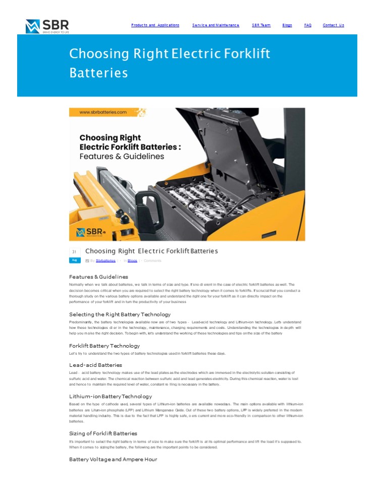Title: SBR Batteries, Choosing Right Electric Forklift Batteries | Blogs