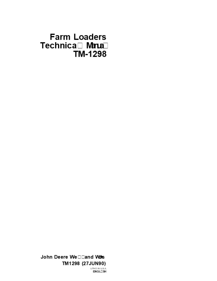 SECTION 10INTRODUCTION AND SAFETY SECTION 70HYDRAULIC COMPONENTS INFORMATION Group 05Introduction Information Group 05Independent Control Valve Group 10Safety Group 10Regenerative Valve Group 15Loader/Tractor Compatibility Group 15Relief Valve Group 20Serial Numbers Group 20Self-Leveling Valve, 110 Loader Group 25Lubricants Group 25Cylinders Group 30Hardware Torque Group 30Hydraulic Connections, Independent Control Valve SECTION 20SPECIFICATIONS Group 05Loaders SECTION 100OPERATION AND TEST Group 10Buckets Group 05Hose Connection Identification Group 15Cylinders Group 10Hydraulic Operational System Group 15Operational Checkout Procedure SECTION 30BUCKETS Group 20Diagnostic And Test Procedure Group 05Replacing Cutting Edge Group 10Installing Competitive Adapters Index Group 15Installing Grapple Reinforcement Group 20Replacing Digging Teeth Group 25Replacing Bucket Bushings SECTION 40BOOM AND MASTS Group 05Inspect Squareness Group 10Replace Boom Bushings, 200 Series Group 15Replace Mast Bushings, 200 Series Group 20Replace Bushings 146, 148 And 158 Loaders Group 25Replace Boom Bushings, 100 and 175 Loaders Group 30Replace Bushings, 110 Loader Group 35Replace Bushings, 80 Loader SECTION 50MOUNTING FRAMES Group 05Modifying Mounting Frames Group 10Adjusting Mast Wedges Group 15Battery Box Revisions, 146 Loader On Tractor/SGB Group 20Tighten Tractor Hardware Group 25Tighten Mounting Frame Hardware SECTION 60CONTROLS Group 05Adjust Cables Group 10Change ICV Control Position All information, illustrations and specifications in this manual are based on the latest information available at the time of publication. The right is reserved to make changes at any time without notice. TM1298-19-08JAN02 COPYRIGHT 1990 DEERE COMPANY Moline, Illinois All rights reserved A John Deere ILLUSTRUCTION Manual Previous Editions Copyright 1989 Deere Company 70