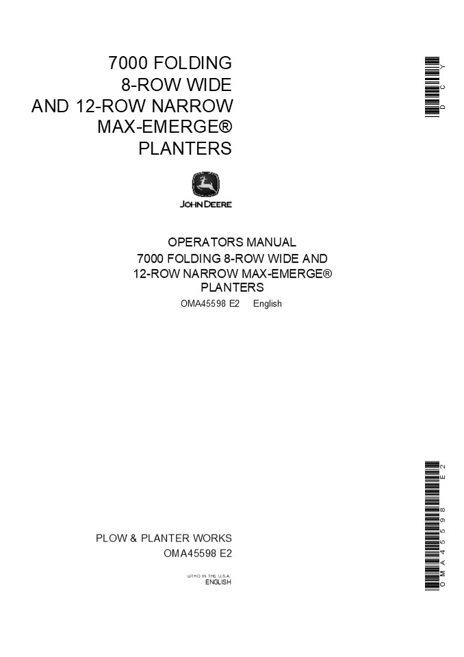 Title: John Deere 7000 Folding 8-Row Wide and 12-Row Narrow Max-Emerge Planters Operator’s Manual Instant Download (Publication No.OMA45598)