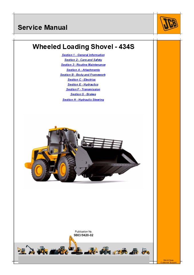 Wheeled Loading Shovel - 434S Section 1 - General Information Section 2 - Care and Safety Section 3 - Routine Maintenance Section A - Attachments Section B - Body and Framework Section C - Electrics Section E - Hydraulics Section F - Transmission Section G - Brakes Section H - Hydraulic Steering Publication No. 9803/9420-02 World Class Customer Support