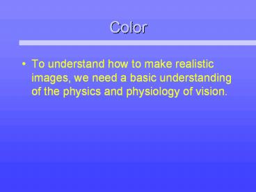 Color. To understand how to make realistic images, we need a basic understanding ... The center of the retina is a densely packed region called the fovea. ... – PowerPoint PPT presentation