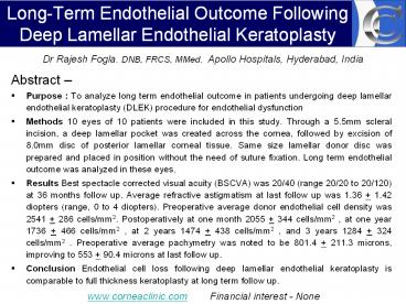 Keratoplasty have been reported in literature 2-5 - This poster presents long term endothelial