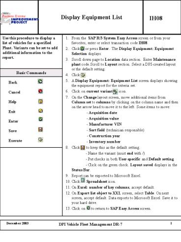 Use this procedure to display a list of vehicles for a specified Plant. Variants can be set to add additional information to the report. From the SAP R/3 System Easy Access screen or from your favorites, enter or select transaction code IH08. Click or press Enter. The Display Equipment Equipment Selection displays. Scroll down page to Location data section. Enter Maintenance plant code.Scroll to Layout section. Select a DPI-created layout or the default setting. Click . A Display Equipment Equipment List screen displays showing the equipment report for the criteria set. Click on current variant icon. On the Change layout screen, move additional items from Column set to columns by clicking on the column name and then on the arrow head to move it to the left. Some items to move - Acquisition date - Acquisition value - Manufacturer VIN - Sort field (technician responsible) - Construction year - Inventory number Click to keep this as the default setting. - Name the variant (must end with /) - Put checks in both User-specific and Default setting. - Click on the green check. Layout saved displays in the Status Bar. Report can be exported to Microsoft Excel. Click Spreadsheet icon. On Excel number of key columns, accept default. On Export list object to XXL screen, select Table. On next screen, accept default. Data exports to Microsoft Excel. Save it to your hard drive. Click on to return to SAP Easy Access screen.