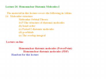 Title: Lecture 26: Homonuclear Diatomic Molecules-I
