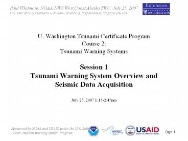 <Notice: Removed> U. Washington Tsunami Certificate Program Course 2: Tsunami Warning Systems Session 1 Tsunami Warning System Overview and Seismic Data Acquisition July 25, 2007 1:15-2:45pm PowerPoint PPT Presentation