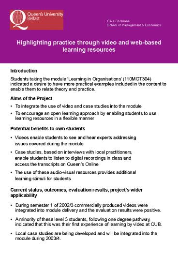 first experience of learning by video at QUB.