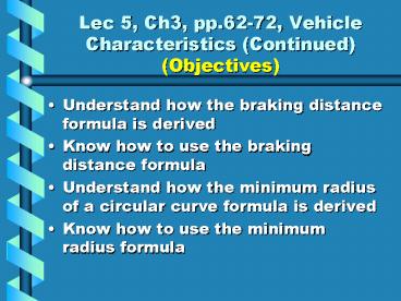 Title: Lec 5, Ch3, pp'6272, Vehicle Characteristics Continued Objectives