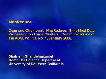 <Notice: Removed> MapReduce Dean and Ghemawat. MapReduce: Simplified Data Processing on Large Clusters. Communications of the ACM, Vol. 51, No. 1, January 2008. PowerPoint PPT Presentation
