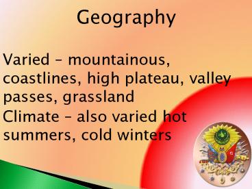Varied mountainous, coastlines, high plateau, valley passes, grassland PowerPoint PPT Presentation