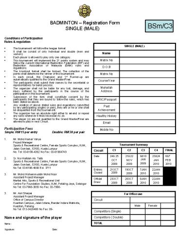 BADMINTON Registration Form SINGLE MALE PowerPoint PPT Presentation