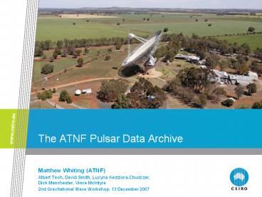 The ATNF Pulsar Data Archive. Matthew Whiting (ATNF) ... Provides a historical record of pulsar timing data. A key element of being a National Facility. ... – PowerPoint PPT presentation