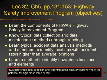 Title: Lec 32, Ch5, pp'131153: Highway Safety Improvement Program objectives
