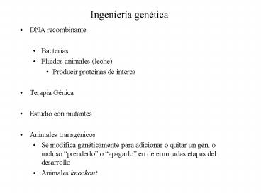 • Modificación genética de organismos complejos,
