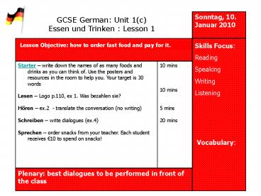 Title: GCSE German: Unit 1c Essen und Trinken : Lesson 1