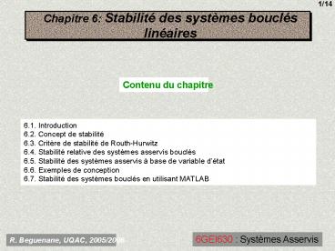 Title: Chapitre 6: Stabilit des systmes boucls linaires