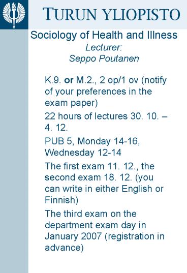 Title: Sociology of Health and Illness Lecturer: Seppo Poutanen