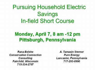 www.safeclimate.net/calculator. www.earthlab.com ... 717-293-8990. tsterner_at_pureenergyaudits.com. Rana Belshe. 715-334-2707. ranabelshe_at_centurytel.net ... – PowerPoint PPT presentation