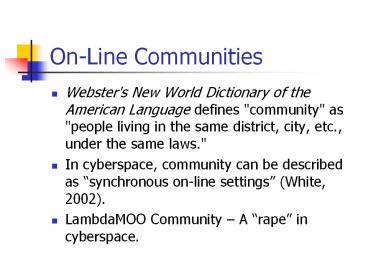 synchronous on-line settings (White, 2002). - LambdaMOO Community A rape in cyberspace.