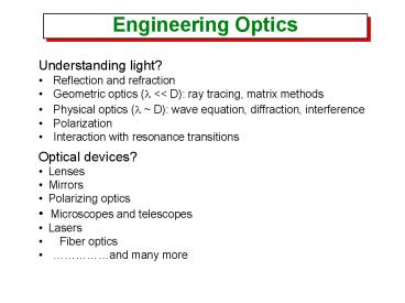 - Geometric optics (l ltlt D) ray tracing, matrix