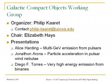 Galactic Compact Objects Working Group. Organizer: Philip Kaaret. Contact philip-kaaret_at_uiowa.edu ... Alice Harding Multi-GeV emission from pulsars ... – PowerPoint PPT presentation