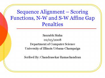 Sequence Alignment Scoring Functions, N-W and S-W Affine Gap Penalties. Saurabh Sinha ... Affine Gap Functions. Shortcomings of a general gap penalty function: ... – PowerPoint PPT presentation