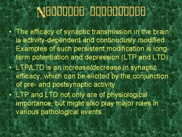 inhibitory synaptic transmission. - LTP, the long lasting enhancement of synaptic