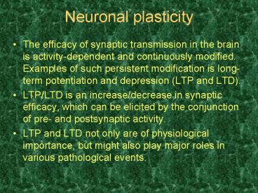 inhibitory synaptic transmission. - LTP, the long lasting enhancement of synaptic