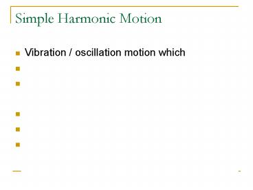 17 Simple Harmonic Motion ms 18 Simple Harmonic Motion ms 19 Simple Harmonic Motion 0 ms 3.1 ms 6.3ms 9.6ms ms 20 Simple Harmonic Motion 0 ms 3.1 ms 6.3ms 9.6ms ms 21 Simple Harmonic Motion 0 ms 3.1 ms 6.3ms 9.6ms ms 22 Simple Harmonic Motion 0 ms 3.1 ms 6.3ms 9.6ms ms 23 Simple Harmonic Motion 0 ms 3.1 ms 6.3ms 9.6ms ms Frequency cycles per second 24 Simple Harmonic Motion 0 ms 3.1 ms 6.3ms 9.6ms ms Frequency cycles per second 3 cycles / 25 Simple Harmonic Motion 0 ms 3.1 ms 6.3ms 9.6ms ms Frequency cycles per second 3 cycles / 9.6 ms 3 cycles /(.0096s) 26 Simple Harmonic Motion 0 ms 3.1 ms 6.3ms 9.6ms ms Frequency cycles per second 3 cycles / 9.6 ms 3 cycles /(.0096s) 312.5 Hz 27 Simple Harmonic Motion 0 ms 3.1 ms 6.3ms 9.6ms ms Frequency cycles per second 3 cycles / 9.6 ms 3 cycles /(.0096s) 312.5 Hz Period 1 / f 28 Simple Harmonic Motion 0 ms 3.1 ms 6.3ms 9.6ms ms Frequency cycles per second 3 cycles / 9.6 ms 3 cycles /(.0096s) 312.5 Hz Period 1 / f 1 / 312.5 s .0032 s or 3.2 ms on average 29 Simple Harmonic Motion 0 ms 3.1 ms 6.3ms 9.6ms ms Frequency cycles per second 3 cycles / 9.6 ms 3 cycles /(.0096s) 312.5 Hz Period 1 / f 1 / 312.5 s .0032 s or 3.2 ms on average 30 Period of oscillation of a Spring Mass SystemPeriod of oscillation of Pendulum Mass System