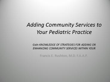 Title: Adding Community Services to Your Pediatric Practice Gain KNOWLEDGE OF STRATEGIES FOR ADDING OR ENHANCING COMMUNITY SERVICES WITHIN YOUR