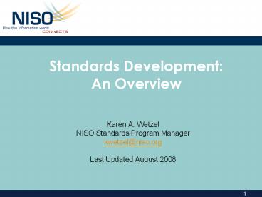 Standards Development: An Overview Karen A. Wetzel NISO Standards Program Manager kwetzel_at_niso.org Last Updated August 2008 Standards Development Phase 1: Idea to ... – PowerPoint PPT presentation
