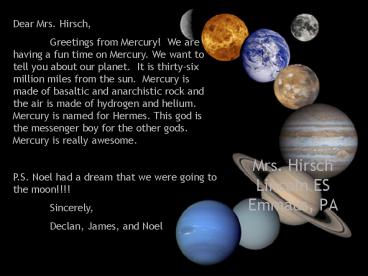 Dear Mrs. Hirsch,  Greetings from Mercury! We