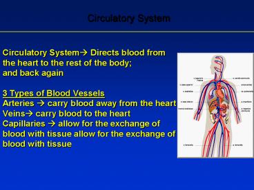 <Notice: Removed> Circulatory System? Directs blood from the heart to the rest of the body; and back again 3 Types of Blood Vessels Arteries ? carry blood away from the heart Veins? carry blood to the heart Capillaries ? allow for the exchange of blood with tissue PowerPoint PPT Presentation