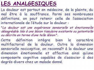 peuvent provoquer une toxicomanie. - II- LES ANALGESIQUES NON MORPHINIQUES