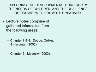 <Notice: Removed> EXPLORING THE DEVELOPMENTAL CURRICULUM, THE NEEDS OF CHILDREN, AND THE CHALLENGE OF TEACHERS TO PROMOTE CREATIVITY PowerPoint PPT Presentation