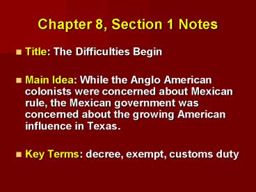 Chapter 8, Section 1 Notes Title: The Difficulties Begin Main Idea: While the Anglo American colonists were concerned about Mexican rule, the Mexican government was ... – PowerPoint PPT presentation