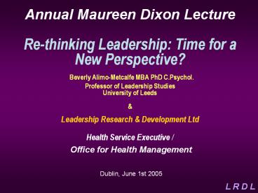 Title: Annual Maureen Dixon Lecture Re-thinking Leadership: Time for a New Perspective? Beverly Alimo-Metcalfe MBA PhD C.Psychol. Professor of Leadership Studies University of Leeds