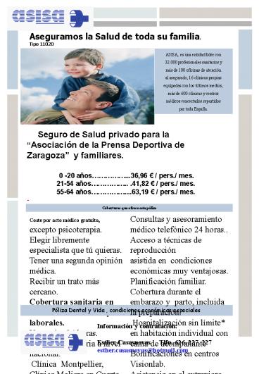 Seguro de Salud privado para la Asociación de la Prensa Deportiva de Zaragoza y familiares. 0 -20 años...36,96 / pers./ mes. 21-54 años.. .41,82 / pers./ mes. 55-64 años....63,19 / pers./ mes. -